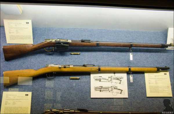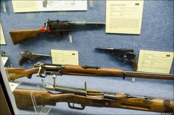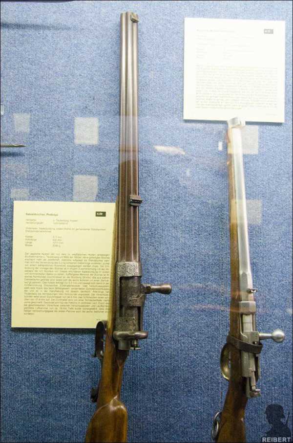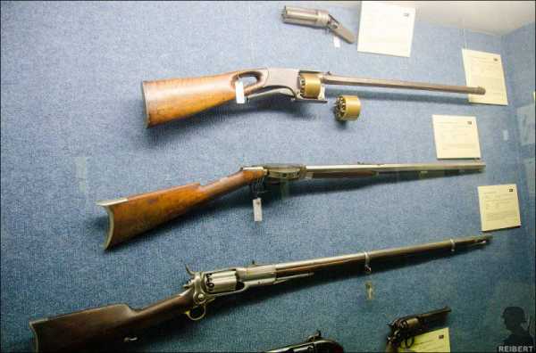 18. В центре — прусский егерский карабин М1865, снизу — прототип многозарядной винтовки с барабанным магазином.