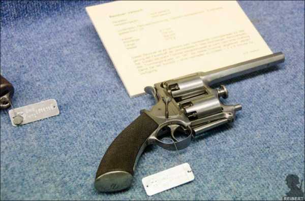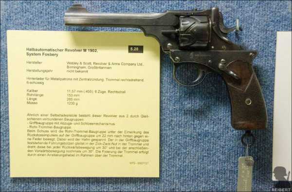34. Британский полуавтоматический ревльвер М1902 системы Фосбери, благодаря специальной системе улавливания отдачи и пазам на барабане, стрельба из револьвера велась автоматически, курок нужно было взвести только перед первым выстрелом.
