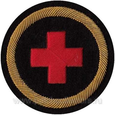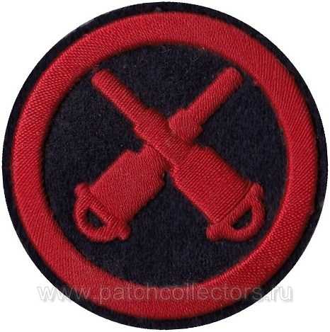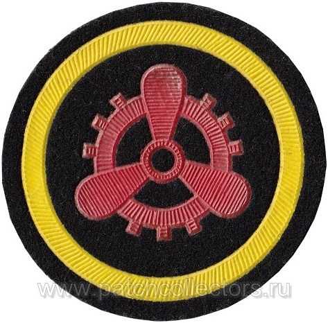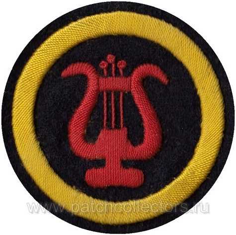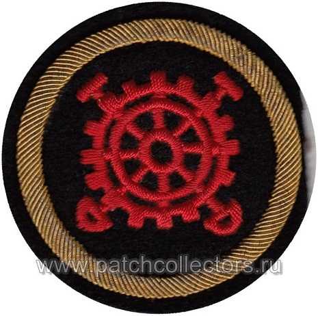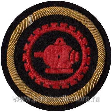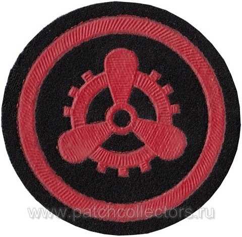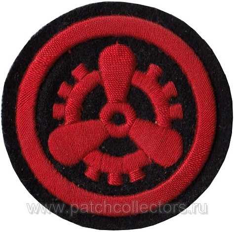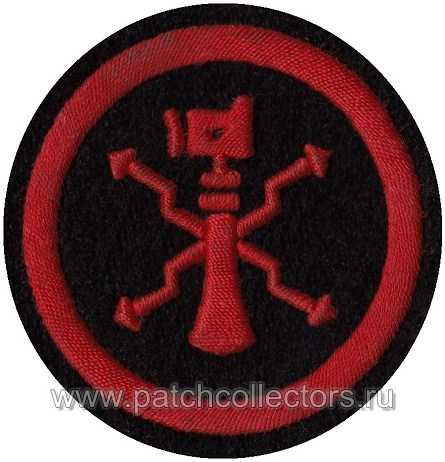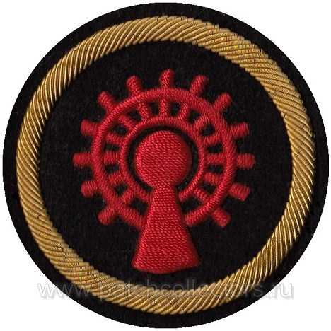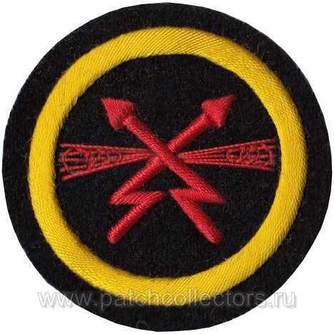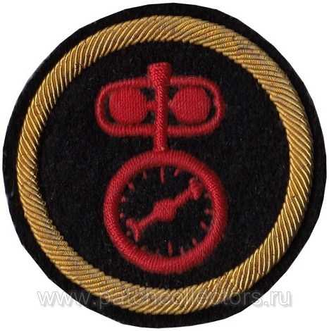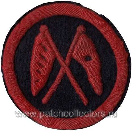 Специалисты рядового и младшего начсостава, кроме нарукавных должностных знаков различия, носят также вышиваемые на черном сукне знаки по специальности. Диаметр круглых знаков -10,5 см. Окружность знаков по специальностям для сверхсрочнослужащих вышивается золотой канителью или желтым шелком, для срочнослужащих красной нитью. Рисунок знака вышивается красной нитью. |