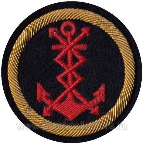 Нарукавный знак Военно-морского флота нового образца Перекрещенные якоря — старинный символ флота. Эмблема утверждена приказом Министра обороны РФ от 15 октября 1999 года № 475 Пришивается на левый рукав, на расстоянии 8 см от верхнего края |