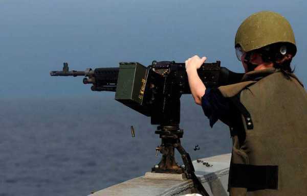 15. Девушка — канонир выстреливает трос в сторону корабля снабжения «Алан Шепард» с борта штурмовика «Боксер». 11 июля 2011.