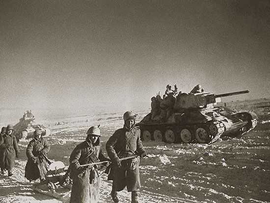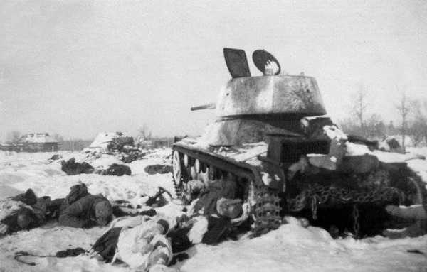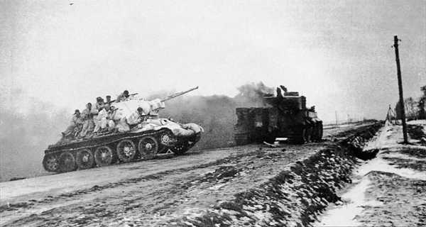 Т-34 образца 1942 года в зимнем камуфляже, с десантом на броне