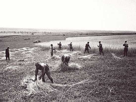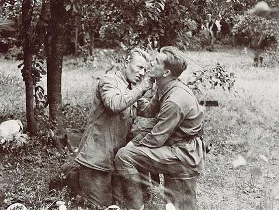 На верхней: 1941. Белоруссия, немецкий репортер ест огурец, предложенный крестьянкой