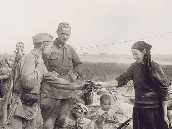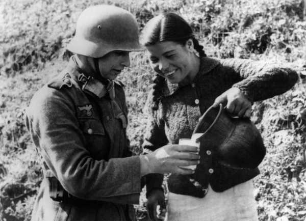 1941.Украина, немецкий солдат принимает предложеный стакан молока