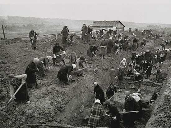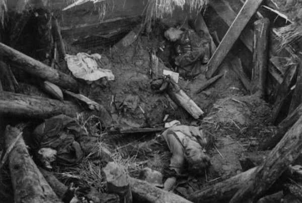 1941. Битва за Москву. Немецкие солдаты захватили русских военнопленных в траншее
