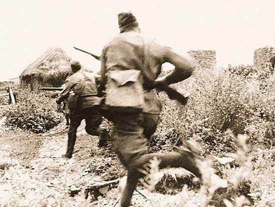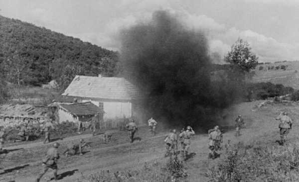 1942. Россия, немецкие солдаты покидают горящую деревню