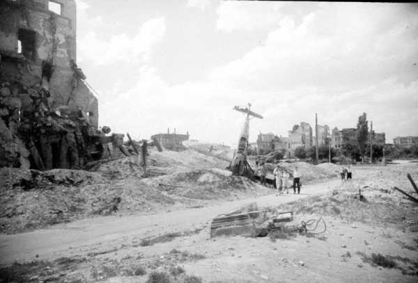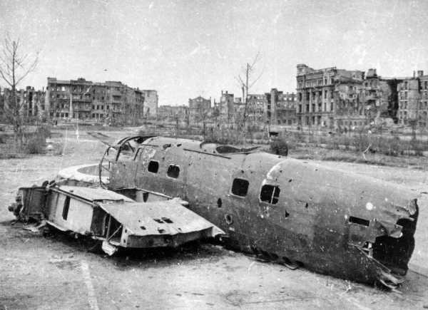 1942. Сталинград, останки немецкого бомбардировщика He-111 среди городских развалин