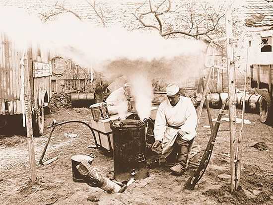 1941. Русские солдаты осматривают трофеи, взятые у немцев и обнаруживают в футляре для противогаза картофель