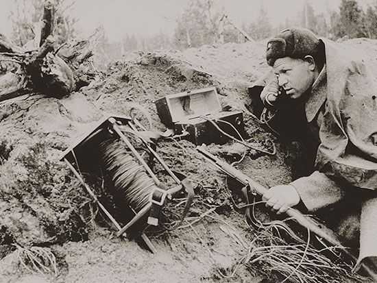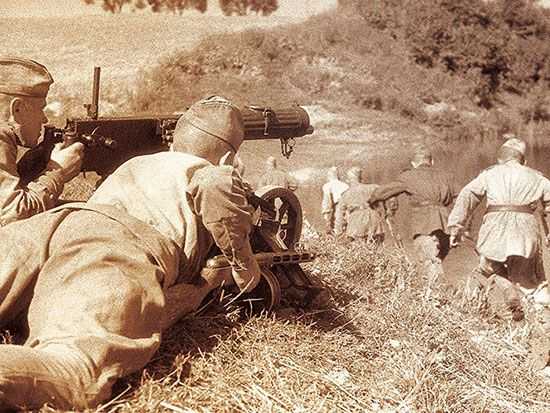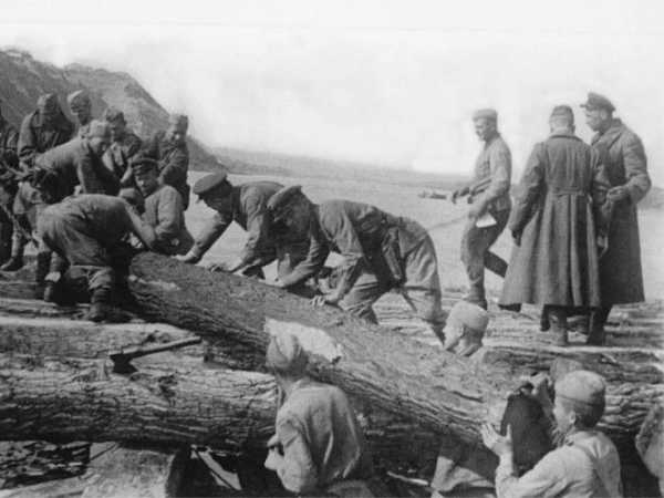 1941. Немецкие солдаты на позиции. За ними в канаве русские военнопленные