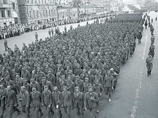 57 000 пленных немцев, в том числе 1227 офицеров, среди которых было и 19 генералов, колоннами, под конвоем бойцов советской армии, прошли по улицам столицы СССР. Это шествие было финалом операции «Багратион», когда войсками 1,2,3 белорусских фронтов была разгромлена нацистская группа армий «Центр» и в плен попало больше 400 000 человек.