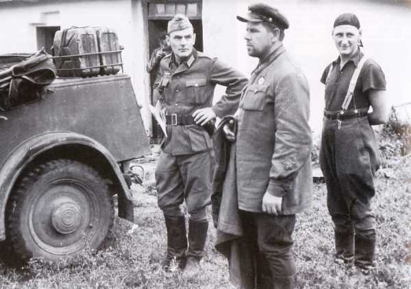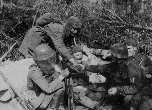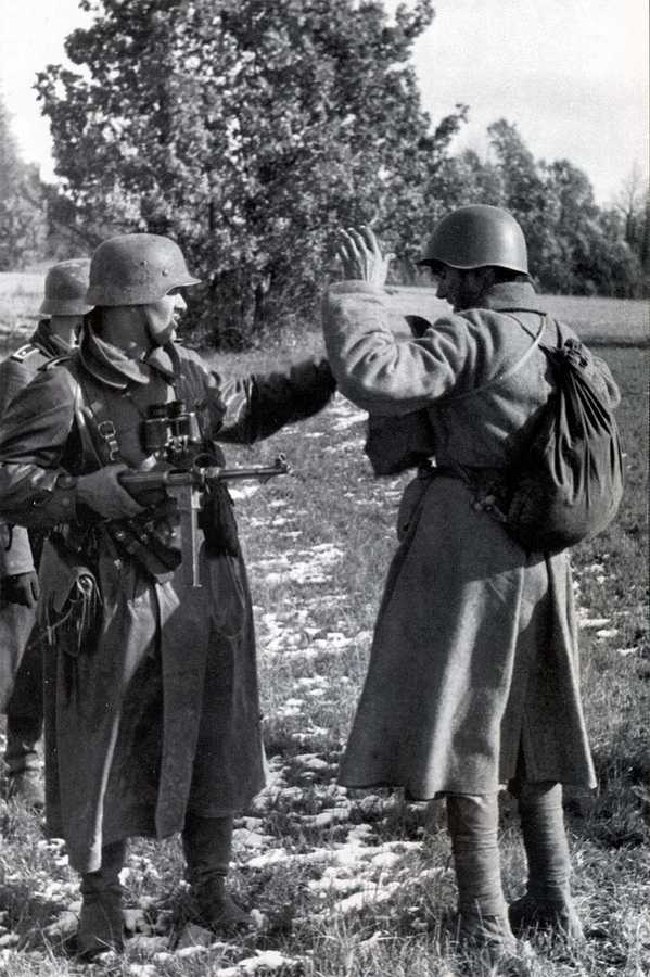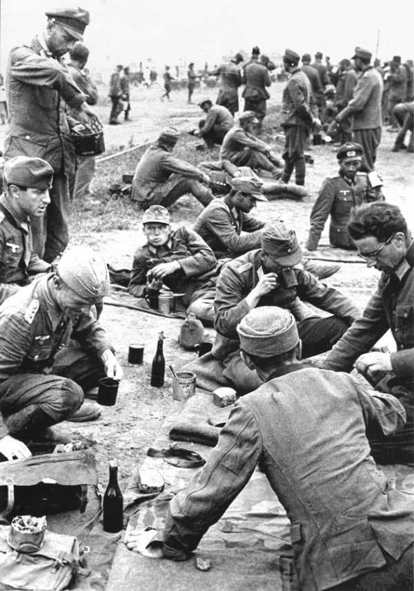 1941.Два русских военнопленных беседуют с немецкими солдатами из Ваффен-СС