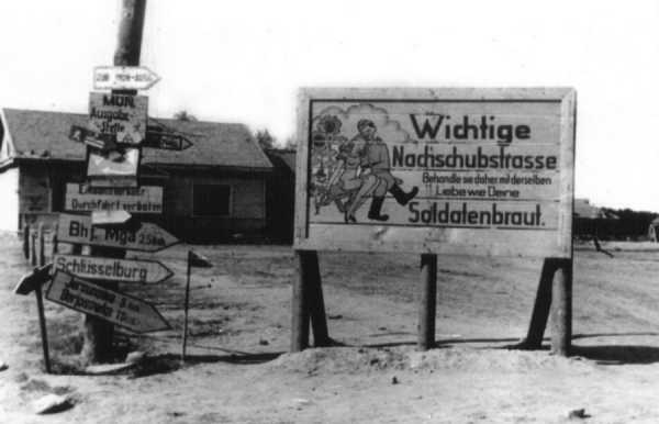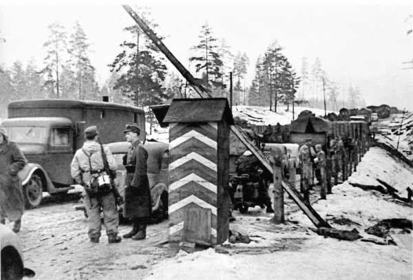1942. Ленинградская область, немецкие войска на контрольно-пропускном пункте на окраине города
