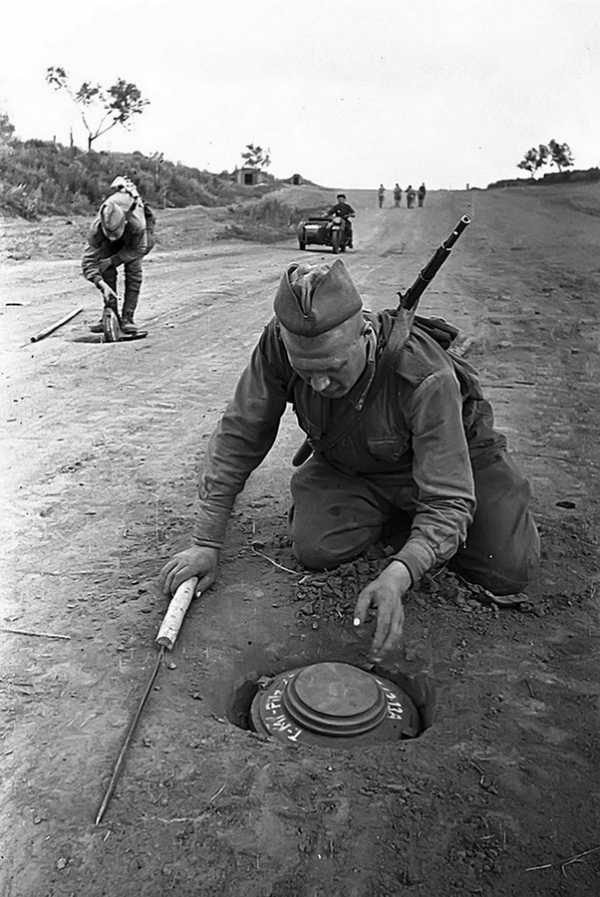 1943. Сапёры обезвреживают немецкие противотанковые мины