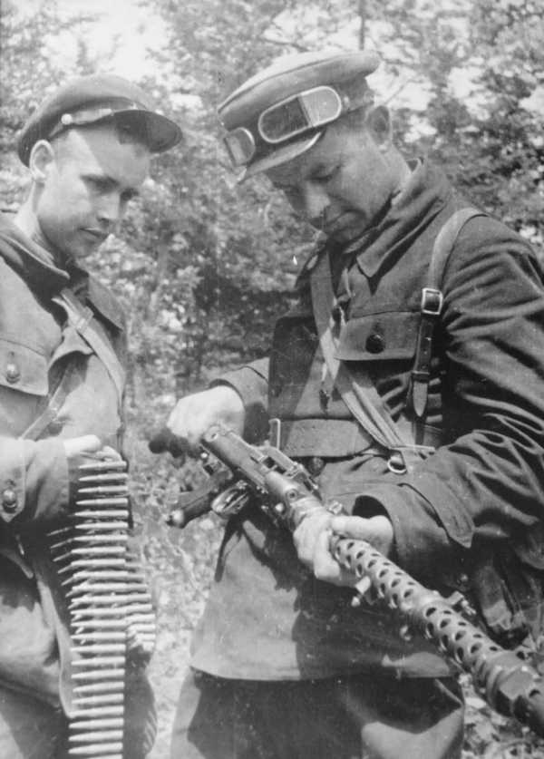 Без даты. Два советских партизана осматривают трофейный немецкий пулемет MG-34