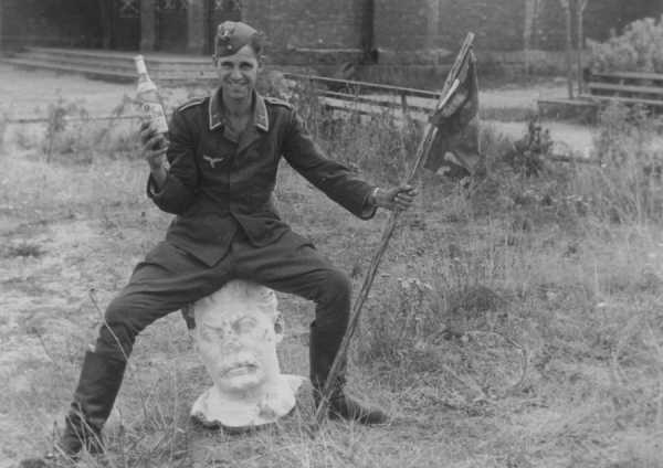 Без даты. Унтер-офицер люфтваффе позирует с бутылкой сидя на голове бюста И.В. Сталина