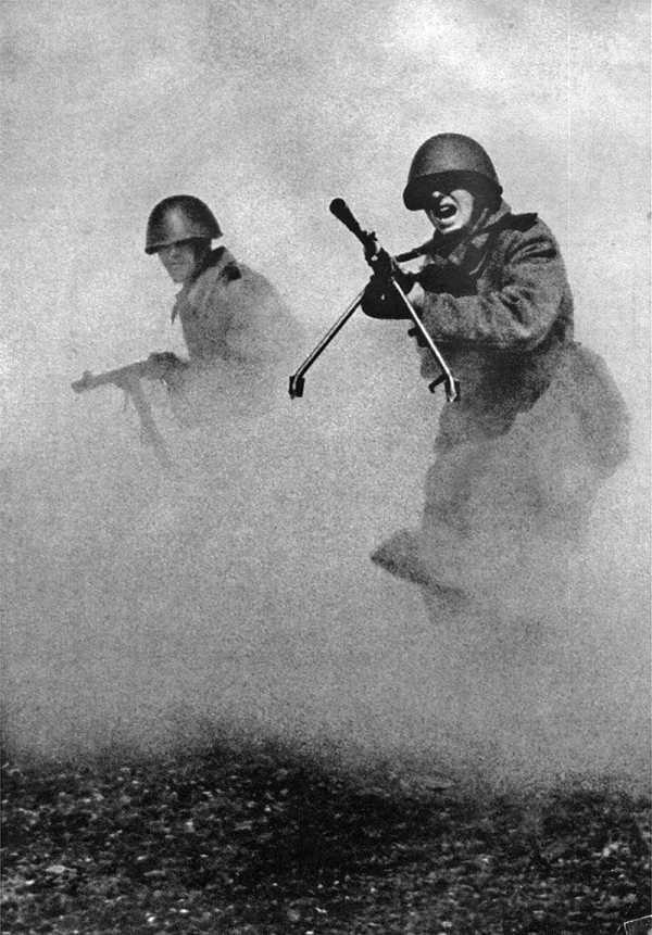 Фото сделано в 1943 году. Сильное фото, даже в «плоском» черно-белом формате оно очень динамичное, эмоциональное. Солдат справа вооружен ручным пулеметом Дегтярева (ДП), а вот вооружение бойца слева вызывает вопросы. По виду ствола и мушке, это явно пистолет-пулеметом ППШ, а вот почему у него магазин не только не дисковый, но и не изогнутый рожковый, а прямой?