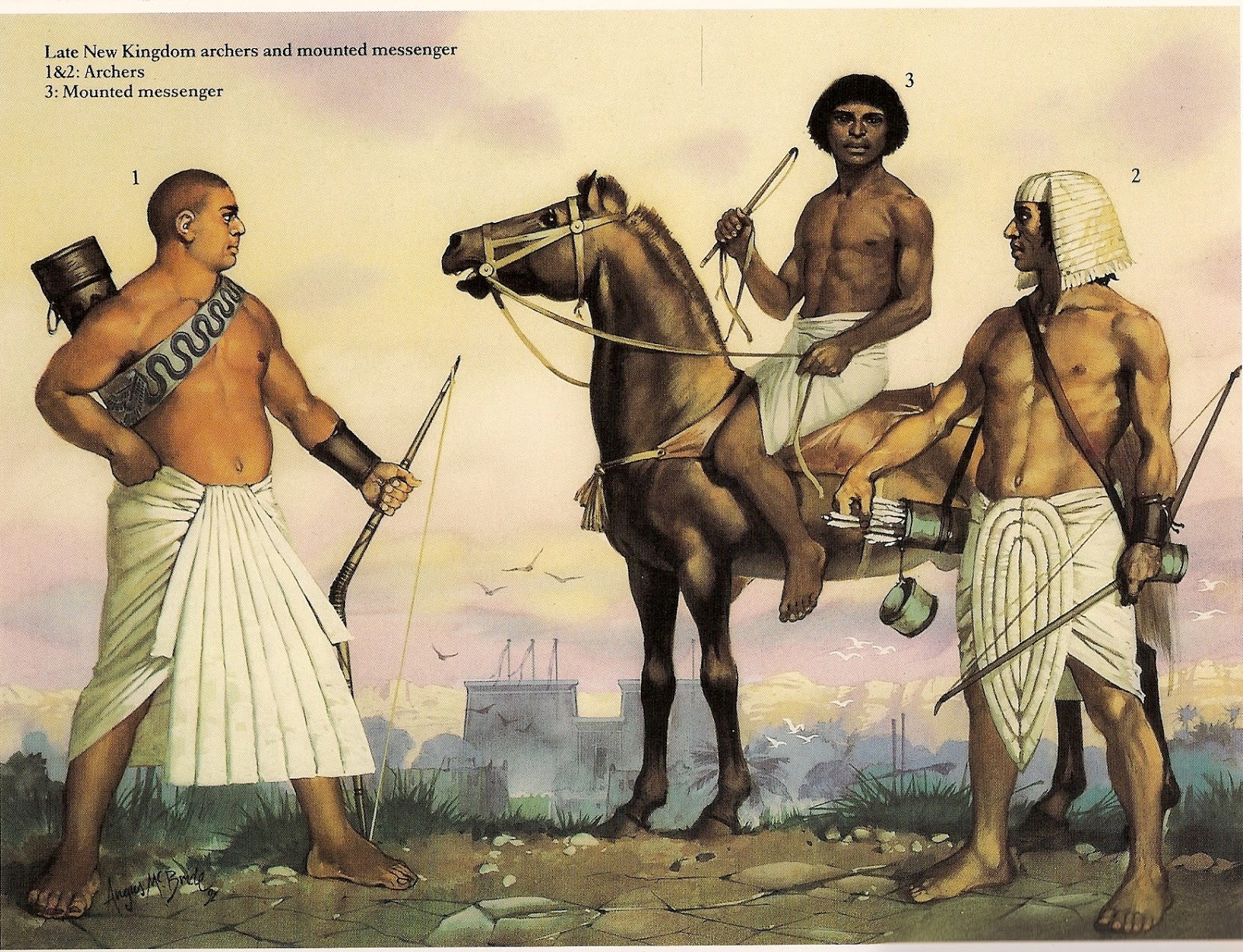 Египтяне использовали простой одноарочный лук, который было трудно натянуть, он имел малую дальность и ненадежную точность. Все солдаты были из низшего сословия крестьян и мало обучены. Маловероятно, хотя и возможно, что у них был опыт обращения с луком на охоте. Крестьянство в Египте не владело землей, и охота была запрещена без согласия землевладельца из высшего сословия. Кроме того, египетская диета была в основном вегетарианской, а охота была королевским видом спорта. Тем не менее, с лучниками, стреляющими в массовом порядке с близкого расстояния это оружие могло быть очень эффективным. После залпа или двух стрел солдаты сближались со своими противниками, используя ручное оружие.