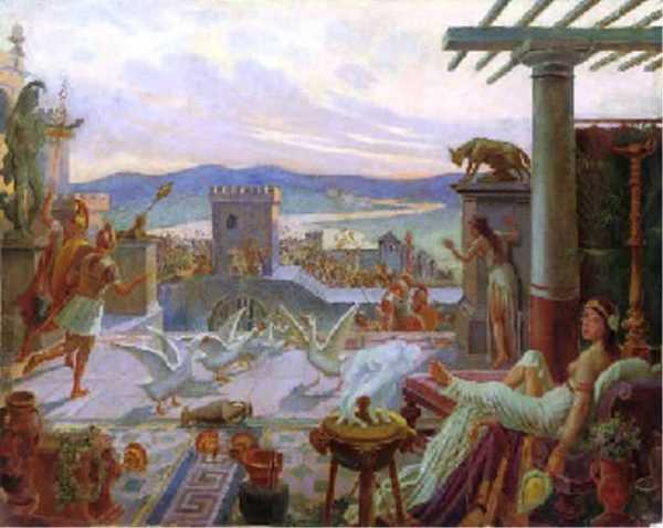 Традиция сохранила нам один рассказ из истории этой осады, который получил мировую известность. Однажды ночью отряд галлов поднялся по крутому склону Капитолия. Варвары карабкались так тихо, что не только стража, но даже собаки ничего не слыхали. Только гуси, посвященные богине Юноне, подняли гоготанье. Шум разбудил бывшего консула Марка Манлия, дом которого находился на Капитолии. Он бросился к обрыву и столкнул в пропасть первого галла, уже поднявшегося на вершину. На помощь Манлию поспешила проснувшаяся стража, и всех галлов постигла участь их головного воина. Марк Манлий стал народным героем и получил прозвище «Капитолийского»2, что не помешало ему впоследствии пасть жертвой сословной борьбы. Этот рассказ так своеобразен, что не мог быть выдуман целиком. По-видимому, в основе его лежит подлинное событие.