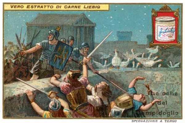 «Под покровом ночи они сперва выслали вперед безоружного лазутчика, чтобы разведать дорогу, а потом полезли наверх уже все. Там, где было круто, они передавали оружие из рук в руки; одни подставляли плечи, другие взбирались на них с тем, чтобы потом вытащить первых; если было нужно, все подтягивали друг друга и пробрались на вершину так тихо, что не только обманули бдительность стражи, но даже не разбудили собак… Но их приближение не укрылось от гусей, которых, несмотря на острейшую нехватку продовольствия, до сих пор не съели, поскольку они были посвящены Юноне. От их гогота и хлопанья крыльев проснулся Марк Манлий, знаменитый воин, бывший консулом три года назад. Схватившись за оружие и одновременно призывая к оружию остальных, он среди всеобщего смятения кинулся вперед и ударом щита сбил вниз галла, уже стоявшего на вершине. Покатившись вниз, галл в падении увлек за собой тех. кто поднимался вслед за ним, а Манлий принялся разить остальных… Вскоре сбежались и другие римляне: они начали метать стрелы и камни, скидывая врагов со скал. Среди всеобщего обвала галльский отряд покатился к пропасти и рухнул вниз».