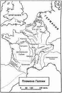 Галлами римляне называли племена кельтов за то, что те вставляли в свои головные уборы петушиные перья («галл» на латыни означает «петух»). Исторически Галлией римляне называли область, лежавшую между Пиренеями и рекой Рейном, Средиземным морем и Атлантическим океаном. Галлия делилась на три части. Цизальпинская Галлия, южная часть страны кельтов (римляне завоевали её за три жестокие военные кампании 197, 194 и 191 гг. до н. э.), к середине I в. до н. э. в большой степени была уже романизирована, а её жителей называли «галлами в тоге». Набронская Галлия, или Провинция (нынешний французский Прованс), была оккупирована римлянами в 121 г. до н. э. Северная часть страны, Трансальпийская Галлия, осталась непокорной. Её называли «косматой Галлией», а жителей — «галлами в шароварах». Население «косматой» Галлии насчитывало более 10 млн человек, среди которых самыми многочисленными были племена аквитанов, собственно галльские (кельтские) племена, кельто-германские племена белгов, племенные группы венетов, эдуев, секванов, арвернов.