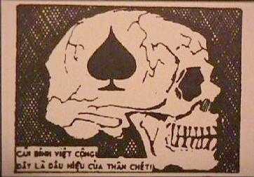 Это было в 1966 когда некоторые офицеры спецназа из IV Корпуса работавшие вокруг территории Отца Хоа(китаец,католический священник,собравший небольшую армию из прихожан и боровшийся с Вьетконгом)заказали у нас в типографии отпечатать несколько подобных карт для того что бы оставлять их на телах вьетконговцев,но в реальной практике карта часто вставлялась в рот.
