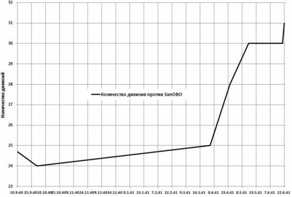 На основе информации Разведуправления Генштаба на рисунке приведена зависимость изменения числа немецких дивизий у границы. Слова «у границы» не нужно понимать дословно, так как большая часть войск противника располагались за десятки и даже сотни километров от госграницы.