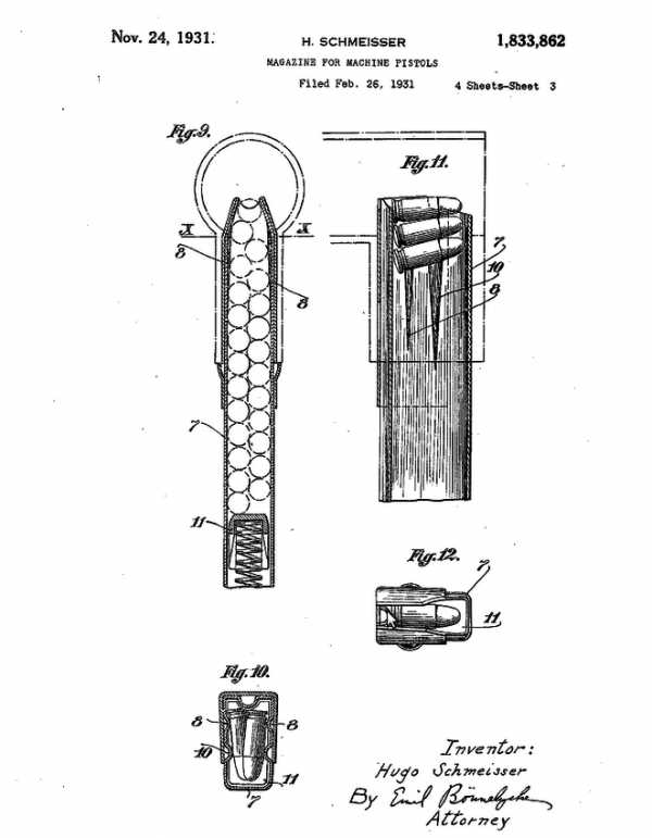 Техническая справка о магазине к Парабеллуму с патентом Шмайссера. Эту справку я даю для того, чтобы облегчить труд любознательных, которые после прочтения статьи начнут гуглить по ключу «patent schmeisser». К своему удивлению они наткнутся вот на это: