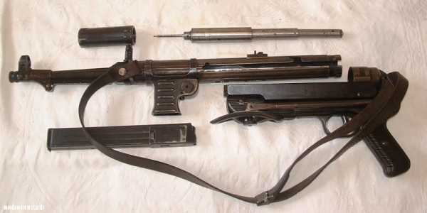 Хуго Шмайссер не устоял перед соблазном выжать из пистолетного патрона и своего MP-28 максимум. Он удлиняет ствол, переносит горловину магазина вниз, и самое главное, скромно и элегантно «взаимствует» у Фольмера его возвратную пружину в телескопическом кожухе. Изделие получило название MK-36.