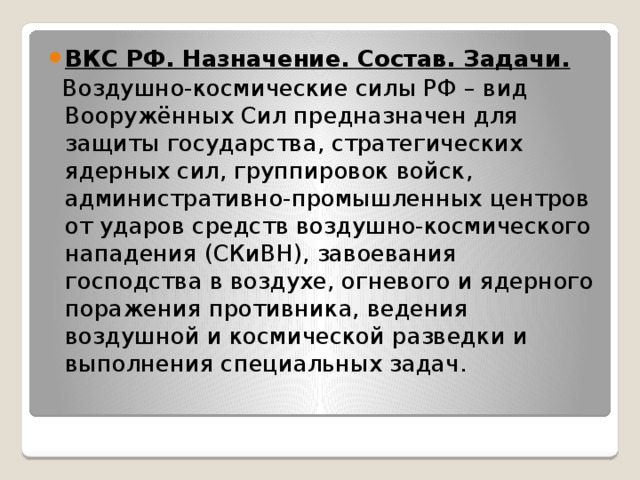 Космические войска РФ — род войск центрального подчинения, предназначенный для своевременного предупреждения высшего военно-политического руководства о ракетном нападении, контроля космического пространства, противоракетной обороны отдельных районов, отражения нападения противника в космосе и из космоса, обеспечения деятельности Вооруженных сил РФ в мирное и военное время.
