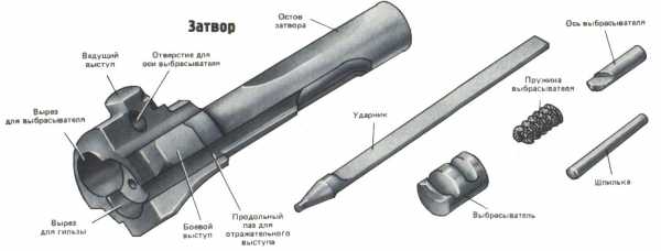 Затвор – служит для запирания канала ствола, производства выстрела и извлечения стреляной гильзы. Он состоит из остова, ударника, выбрасывателя с пружиной и осью, шпильки.