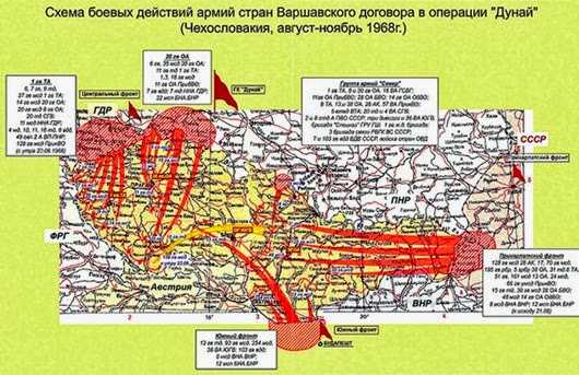 братскими странами. К августу 68-го обстановка в Чехословакии обострилась до предела, страна стояла на грани контрреволюционного переворота и гражданской войны. После обращения членов ЦК КПЧ и депутатов Национального Собрания к правительствам СССР и других братских стран оказать интернациональную помощь перед угрозой вторжения войск НАТО (а такие переговоры уже велись) страны — участницы Варшавского Договора решили ввести на территорию ЧССР войска. Этому предшествовала разработка нашим Генштабом спецоперации «Дунай». В западных военных округах войска спешно приводились в состояние повышенной боевой готовности. Получив директиву Генштаба о проведении операции «Дунай», солдаты, офицеры и сверхсрочники, отмобилизованные в военные городки, стали готовиться к маршу в районы сосредоточения на территории ГДР и Чехословакии. В короткий срок в западных военных округах СССР было отмобилизовано и поставлено под ружье около 3 миллионов человек. В боевую готовность были приведены и войска стран Варшавского Договора. В воздухе запахло войной, поскольку объявили повышенную боевую готовность и в войсках НАТО. Медлить было нельзя, поэтому директивой Генштаба 750-километровый марш на территорию ЧССР решено было осуществить в течение суток. В ходе марша через Польшу и ГДР наши войска встречали по-разному: в Польше с большой прохладцей, в ГДР — с цветами. Встречали советских солдат в Чехословакии неоднозначно — трудящиеся проявляли к ним безразличие, военные выказывали недовольство, а молодежь большей частью демонстрировала враждебность, которая часто переходила в провокационные выходки. Нашим солдатам и офицерам было приказано на провокации не реагировать, а проводить разъяснительную работу среди населения о необходимости ввода войск, чтобы оградить народную власть, трудовой народ от оккупации страны войсками НАТО. Командующему ВДВ сообщалось, что в район десантирования 9-й и 103-й воздушно-десантных дивизий (ВДД) в течение первых двух суток выходят войска 1-й танковой армии в составе 9-й, 11 -и, 20-й танковых и 14-й мотострелковой дивизий, а на аэродромах Рузине и Кбели высаживаются вертолетные десанты из Группы советских войск в Германии (ГСВГ) и Северной группы войск (СГВ). Накануне ввода войск в Прагу и Брно приехали офицеры ВДВ и военно-транспортной авиации, переодетые в форму гражданских летчиков СССР. Они в короткие сроки провели разведку объектов и благополучно вернулись. К исходу дня разведданные были переданы в Москву. Имелись свои особенности и в механизме создания группировки войск. Наряду с советскими соединениями в нее входили формирования стран Варшавского Договора — ГДР, ПНР, ВНР и НРБ. Соединения и части с конца мая 1968 г. сосредоточивались на границе с Чехословакией, прежде всего в Польше, Восточной Германии и СССР. Сосредоточение войск на границах Чехословакии осуществлялось скрытно. С этой целью был проведен ряд учений. В середине мая войска получили распоряжение о том, что в ближайшее время на территории Польши, ГДР, Чехословакии и Советского Союза состоится совместное учение войск государств — участников Варшавского Договора. Первоначально оно планировалось как войсковое с привлечением значительных воинских контингентов, но по настоянию чехословацкой стороны проводилось как командно-штабное. К нему привле