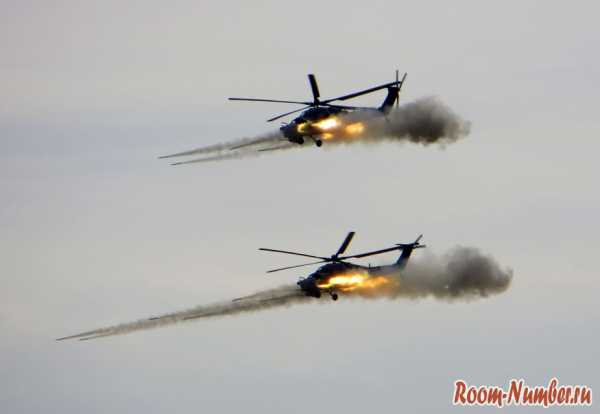 Ми-28 атакуют НАРами (неуправляемыми авиационными ракетами)
