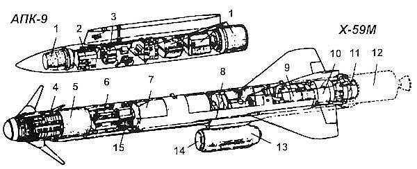 Для размещения Х-59М на носителе служило то же устройство АКУ-58-1. А в комплексе вооружения Су-24М, оснащенного бортовой системой управления оружием СУО-1-6М и подвесным аппаратным контейнером АПК-9, ракета могла применяться без каких-либо доработок самолета. Испытания Х-59М были также начаты и на ударных модификациях Су-27. Все агрегаты фюзеляжа ракеты стыкуются на быстроразъемных соединениях. Носовой кок сбрасываемый, выполнен из материала АМГ-6. Грузовой отсек — из материала ВНС-2, обшивка крыла из АМГ-6, лонжероны из ВКЛ-3. Отсеки фюзеляжа имеют внутреннюю теплоизоляцию из материала АТМ9-200, приклеенную к обшивке клеем ВК-9.