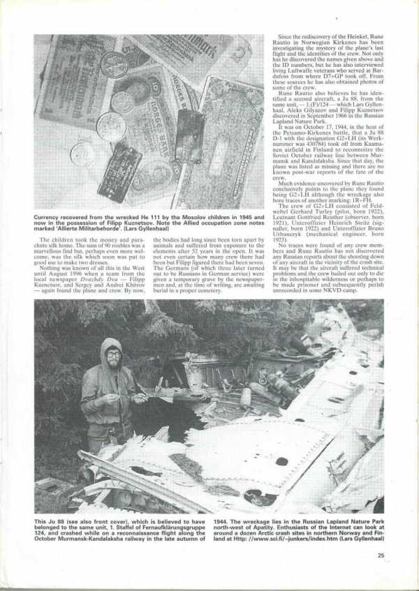 По второй версии найден местными детьми. Первая публикация об этом самолете была в «Дважды два» в 90-х. Там было интервью с апатитчанкой, которая одной из первых оказалась у разбившегося Хейнкеля, она и сейчас жива и, надеюсь, здорова, зовут ее Таисия Константиновна Мосолова.