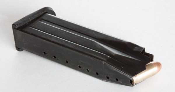Двухсторонний рычажок защелки магазина расположен позади спусковой скобы и укрыт от случайного нажима. Магазин вмещает 12 патронов, уложенных в шахматном порядке. В верхней части двухрядный магазин плавно переходит в однорядный, что придает ему удобную при снаряжении форму и улучшает работу механизма питания. Ступенька и выемка внизу рукоятки облегчают замену магазина. По окончании стрельбы пистолет ставит затворную раму на затворную задержку. Ее удлиненный рычаг размещен на левой стороне рамки.