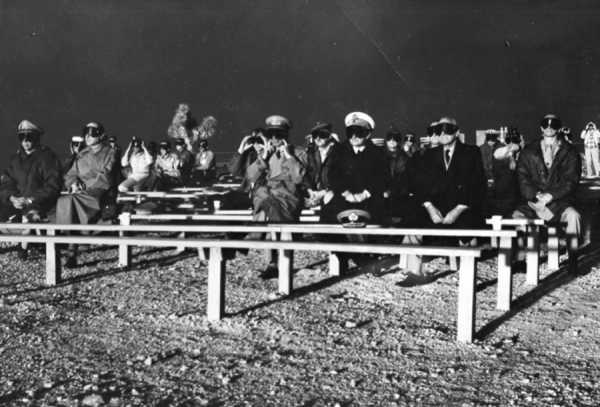 13. Наблюдатели НАТО следят в очках за ядерным испытанием Plumbbob Boltzmann 28 мая1957 года. (Фото Nevada Site Office):