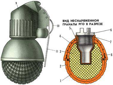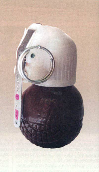 Корпус гранаты представляет собой резиновый шар, в котором находится гильза взрывателя.Граната черная с белыми буквами.