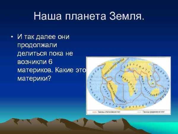 Наша планета Земля. • И так далее они продолжали делиться пока не возникли 6 материков. Какие это материки?