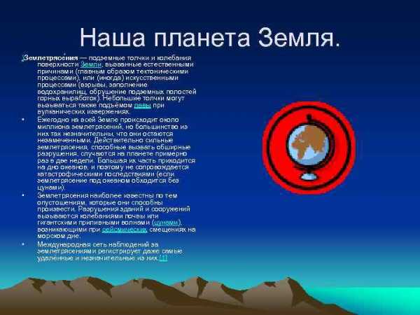 Наша планета Земля. )Землетрясе ния — подземные толчки и колебания поверхности Земли, вызванные естественными причинами (главным образом тектоническими процессами), или (иногда) искусственными процессами (взрывы, заполнение водохранилищ, обрушение подземных полостей горных выработок). Небольшие толчки могут вызываться также подъёмом лавы при вулканических извержениях. • Ежегодно на всей Земле происходит около миллиона землетрясений, но большинство из них так незначительны, что они остаются незамеченными. Действительно сильные землетрясения, способные вызвать обширные разрушения, случаются на планете примерно раз в две недели. Большая их часть приходится на дно океанов, и поэтому не сопровождается катастрофическими последствиями (если землетрясение под океаном обходится без цунами). • Землетрясения наиболее известны по тем опустошениям, которые они способны произвести. Разрушения зданий и сооружений вызываются колебаниями почвы или гигантскими приливными волнами (цунами), возникающими при сейсмических смещениях на морском дне. • Международная сеть наблюдений за землетрясениями регистрирует даже самые удалённые и незначительные из них. [1]
