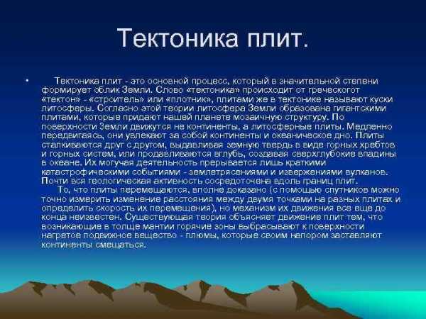 Тектоника плит. • Тектоника плит — это основной процесс, который в значительной степени формирует облик Земли. Слово «тектоника» происходит от греческогот «тектон» — «строитель» или «плотник» , плитами же в тектонике называют куски литосферы. Согласно этой теории литосфера Земли образована гигантскими плитами, которые придают нашей планете мозаичную структуру. По поверхности 3 емли движутся не континенты, а литосферные плиты. Медленно передвигаясь, они увлекают за собой континенты и океаническое дно. Плиты сталкиваются друг с другом, выдавливая земную твердь в виде горных хребтов и горных систем, или продавливаются вглубь, создавая сверхглубокие впадины в океане. Их могучая деятельность прерывается лишь краткими катастрофическими событиями — землетрясениями и извержениями вулканов. Почти вся геологическая активность сосредоточена вдоль границ плит. То, что плиты перемещаются, вполне доказано (с помощью спутников можно точно измерить изменение расстояния между двумя точками на разных плитах и определить скорость их перемещения), но механизм их движения все еще до конца неизвестен. Существующая теория объясняет движение плит тем, что возникающие в толще мантии горячие зоны выбрасывают к поверхности нагретое подвижное вещество — плюмы, которые своим напором заставляют континенты смещаться.