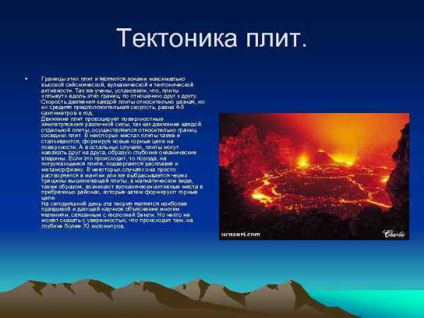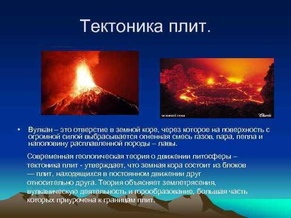 Тектоника плит. • Вулкан – это отверстие в земной коре, через которое на поверхность с огромной силой выбрасывается огненная смесь газов, пара, пепла и наполовину расплавленной породы – лавы. Современная геологическая теория о движении литосферы – тектоника плит — утверждает, что земная кора состоит из блоков — плит, находящихся в постоянном движении друг относительно друга. Теория объясняет землетрясения, вулканическую деятельность и горообразование, большая часть которых приурочена к границам плит.