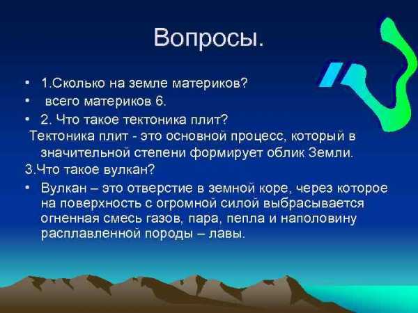 Вопросы. • 1. Сколько на земле материков? • всего материков 6. • 2. Что такое тектоника плит? Тектоника плит — это основной процесс, который в значительной степени формирует облик Земли. 3. Что такое вулкан? • Вулкан – это отверстие в земной коре, через которое на поверхность с огромной силой выбрасывается огненная смесь газов, пара, пепла и наполовину расплавленной породы – лавы.
