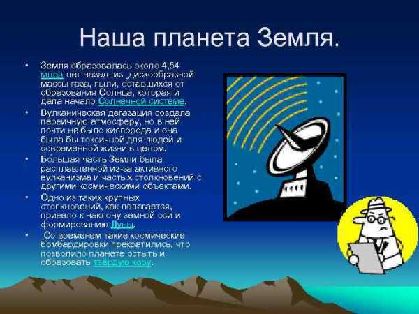 Планета Земля – третья планета от Солнце. В Солнечной системе Земля является пятой по размеру планетой. планета Земля единственной известное место во Вселенной, где есть жизнь. Ученые считают, что Земля образовалась около 5 млрд. лет назад. В процессе формирования, Земля приобрела Луну – свой естественный спутник. Примерно 70% всей площади планеты занимает Мировой океан, остальные 30% приходятся на всю сушу планеты. Чтобы сделать полной оборот вокруг своей оси Земле требуется 23 часа 56 минут. Планета Земля движется вокруг Солнца по эллиптической орбите со средней скоростью 29 км/сек и совершает полный оборот вокруг Солнца за 365,26 суток. Это все факты, вычисленные учеными, но как же возникла сама Земля?