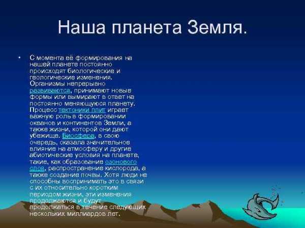 Наша планета Земля. • С момента её формирования на нашей планете постоянно происходят биологические и геологические изменения. Организмы непрерывно развиваются, принимают новые формы или вымирают в ответ на постоянно меняющуюся планету. Процесс тектоники плит играет важную роль в формировании океанов и континентов Земли, а также жизни, которой они дают убежище. Биосфера, в свою очередь, оказала значительное влияние на атмосферу и другие абиотические условия на планете, такие, как образование озонового слоя, распространение кислорода, а также создание почвы. Хотя люди не способны воспринимать это в связи с их относительно коротким периодом жизни, эти изменения продолжаются и будут продолжаться в течение следующих нескольких миллиардов лет.