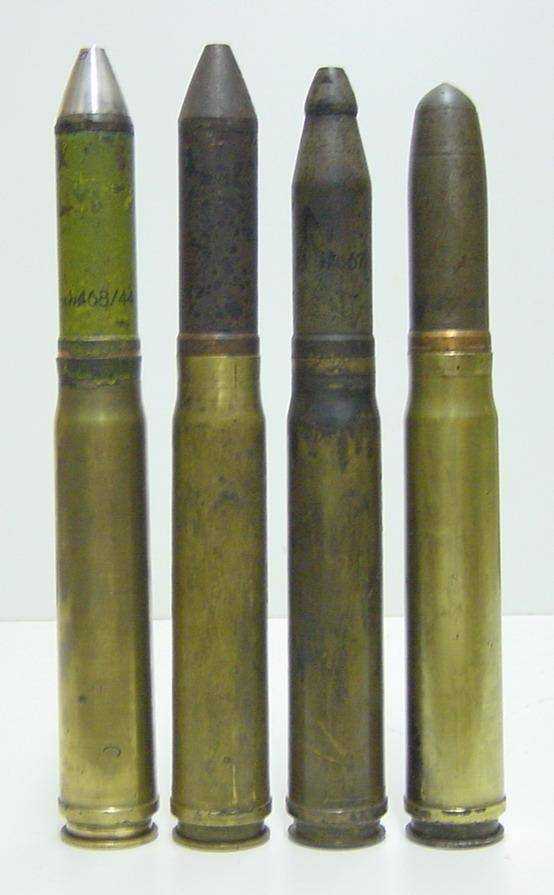 Снаряды для 30-мм пушки МК.103 слева направо: фугасный, практический осколочно-трассирующий, фугасный с самоликвидацией, бронебойно-зажигательный