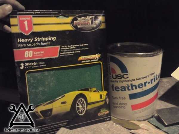 - Когда весь материал прошкурен, можно брать автомобильную шпаклёвку и наносить ею финальный слой. Дождитесь, когда он высохнет, потом снова применяете наждачную бумагу. Следите, чтобы все детали были ровными.