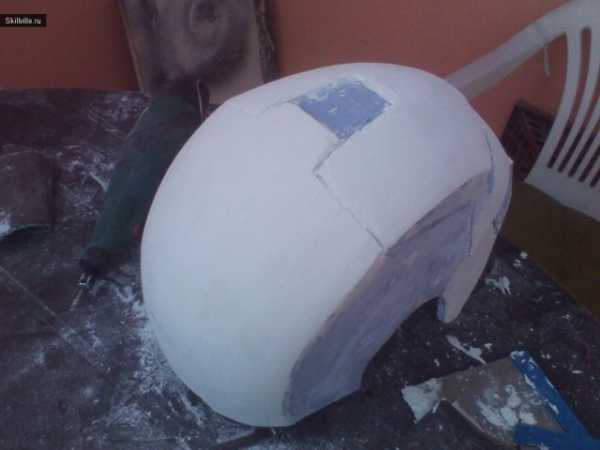 Теперь необходимо все покрыть эпоксидной смолой (двусоставной) и зашкурить, чтобы шлем стал литой. Можно использовать не эпоксидную смолу, а ту, которую вы считаете нужной, просто эпоксидную проще всего найти.