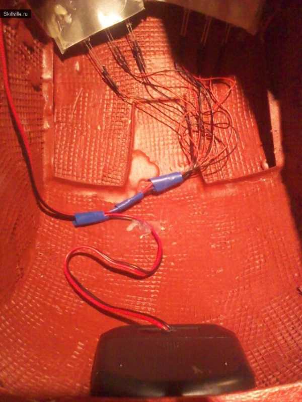 Огни необходимо установить чуть ниже отверстий для глаз, чтобы в маске можно было что-то видеть.