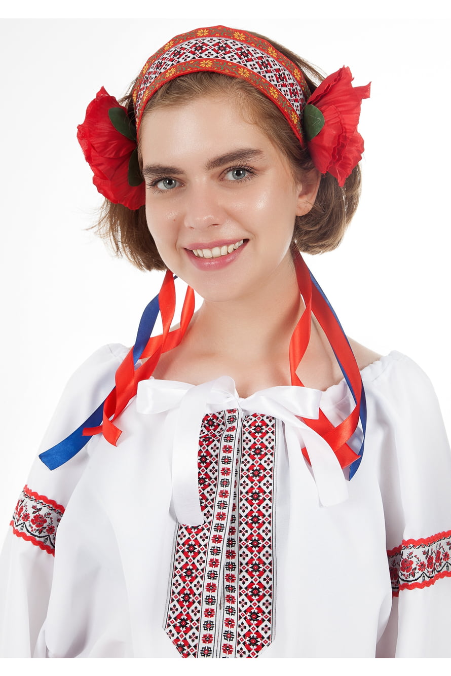 Мы постарались как можно точнее возродить из современных тканей, используя современные технологии в вышивке, костюм, который лег в основу образа украинки в национальном костюме. Красно-черный цветочный орнамент вышивки на очень пышных рукавах сорочки был визитной карточкой центральных областей Украины, а также Полтавщины и Слобожанщины. Праздничная одежда украинок имела некоторое сходство, в зависимости от региона, но не было одинаковых костюмов, т.к. каждая женщина изготавливала одежду сама из того полотна, что выткала своими руками. Пышная юбка из домотканого полотна с полосатым принтом завершала модный силуэт. Поверх юбки одевался нарядный белый вышитый фартук. Все элементы костюма одевались и старательно выкладывались таким образом, чтобы видны были все слои одежды. Признаком достатка девушки считалась корсетка с густыми складками на спине. Складки иногда закладывали в несколько уровней. Чем больше складок — тем больше ткани, тем дороже вещь, тем больше достаток. Еще одним показателем богатства было количество коралловых бус на женской шее.
