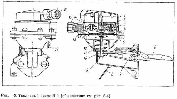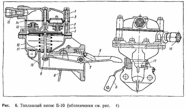 Топливный насос ЗИЛ-131 (рис. 22) — мембранный, герметизированный, с рычагом для ручного подкачивания топлива (при температуре окружающего воздуха ниже —30 °С подкачивать топливо необходимо только после предварительного прогрева двигателя).